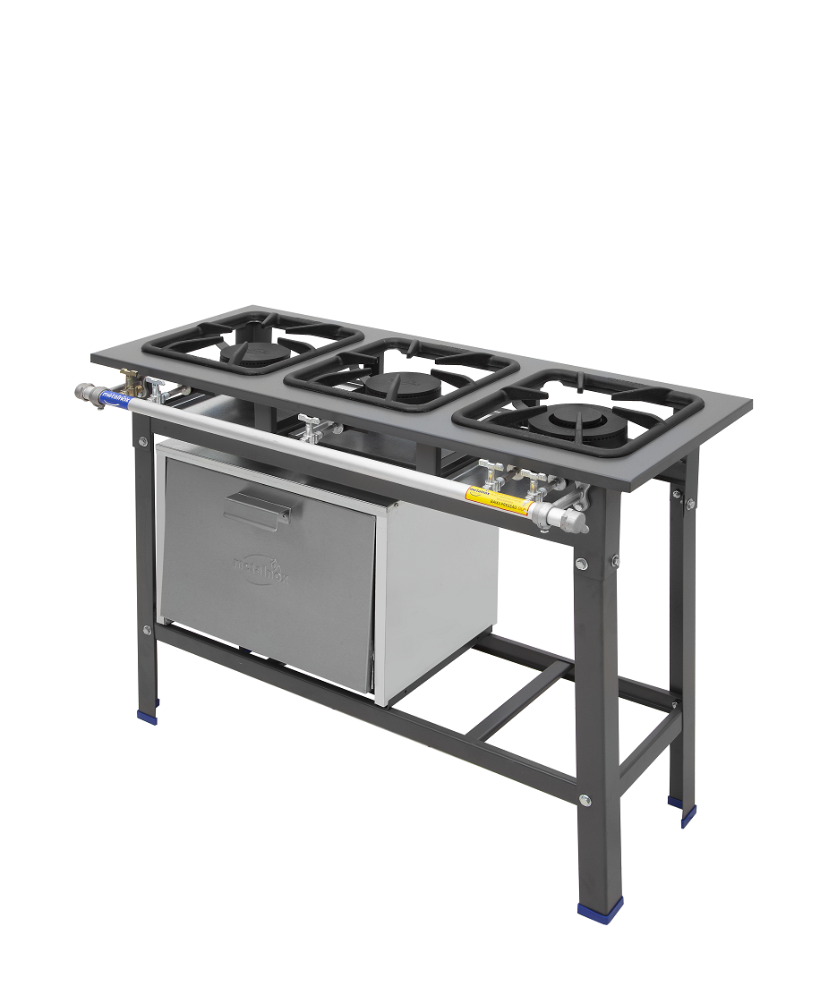 ● Queimadores simples frontais em ferro fundido com vazão de 300g/h e acionamento único do espalhador;