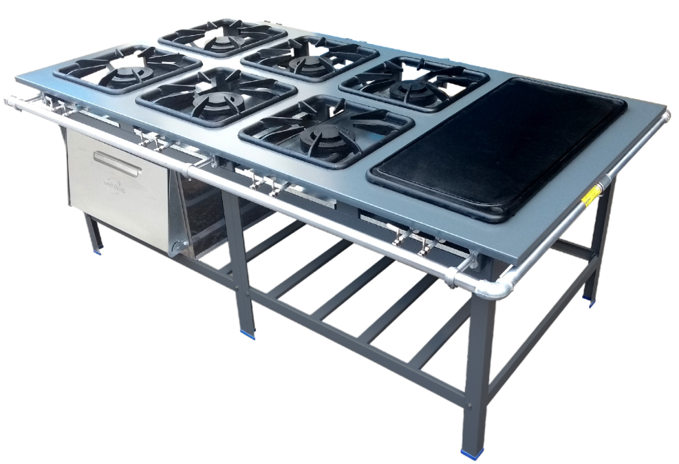 FOGÃO EM PARALELO COM 6 BOCAS, CHAPA BIFETEIRA E FORNO - P/ CENTRO DE COZINHA