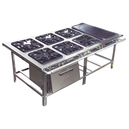 FOGÃO EM PARALELO COM 6 BOCAS, CHAPA BIFETEIRA E FORNO