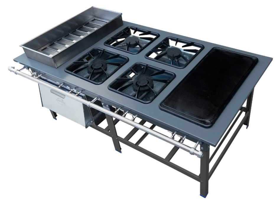 FOGÃO EM PARALELO COM 4 BOCAS, CHAPA BIFETEIRA, BANHO MARIA E FORNO