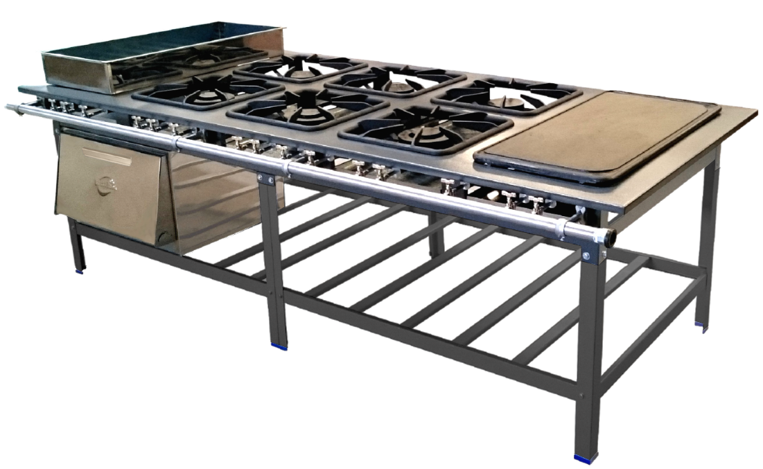 FOGÃO EM PARALELO COM 6 BOCAS, CHAPA BIFETEIRA, BANHO MARIA E FORNO