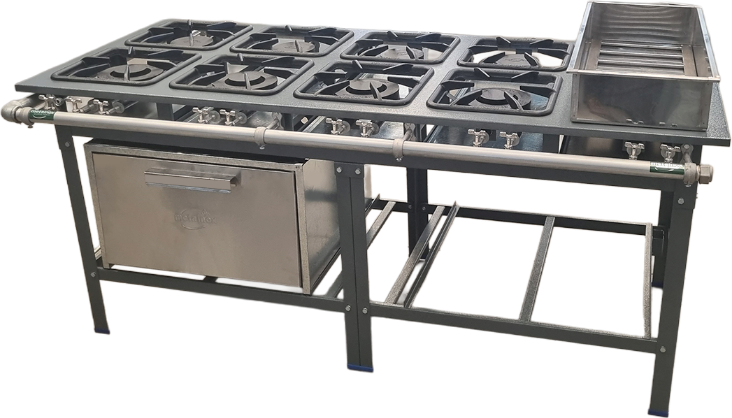 FOGÃO EM PARALELO COM 8 BOCAS, BANHO-MARIA E FORNO