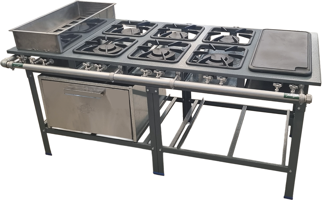 FOGÃO EM PARALELO COM 6 BOCAS, CHAPA BIFETEIRA, BANHO MARIA E FORNO