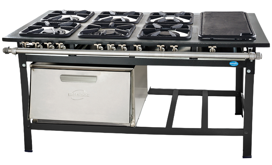 FOGÃO EM PARALELO COM 6 BOCAS, CHAPA BIFETEIRA E FORNO