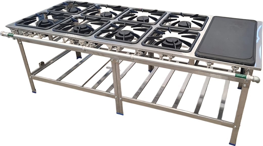 FOGÃO EM PARALELO COM 8 BOCAS, CHAPA BIFETEIRA - P/ CENTRO DE COZINHA