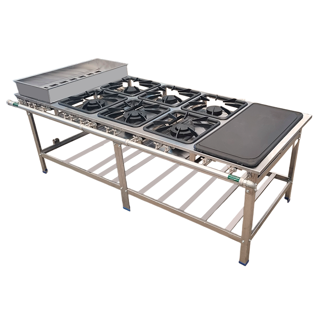 FOGÃO EM PARALELO COM 6 BOCAS, CHAPA BIFETEIRA E BANHO MARIA - P/ CENTRO DE COZINHA