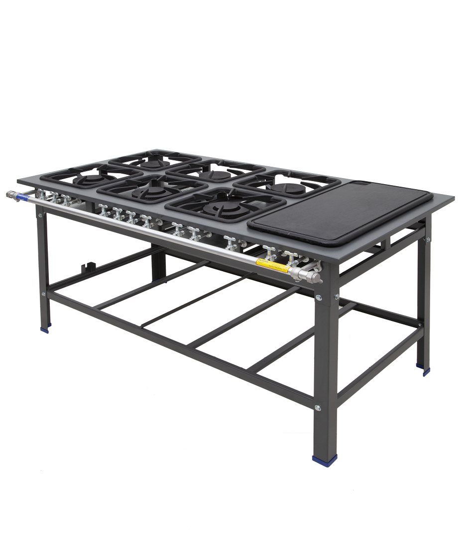 FOGÃO EM PARALELO COM 6 BOCAS, CHAPA BIFETEIRA