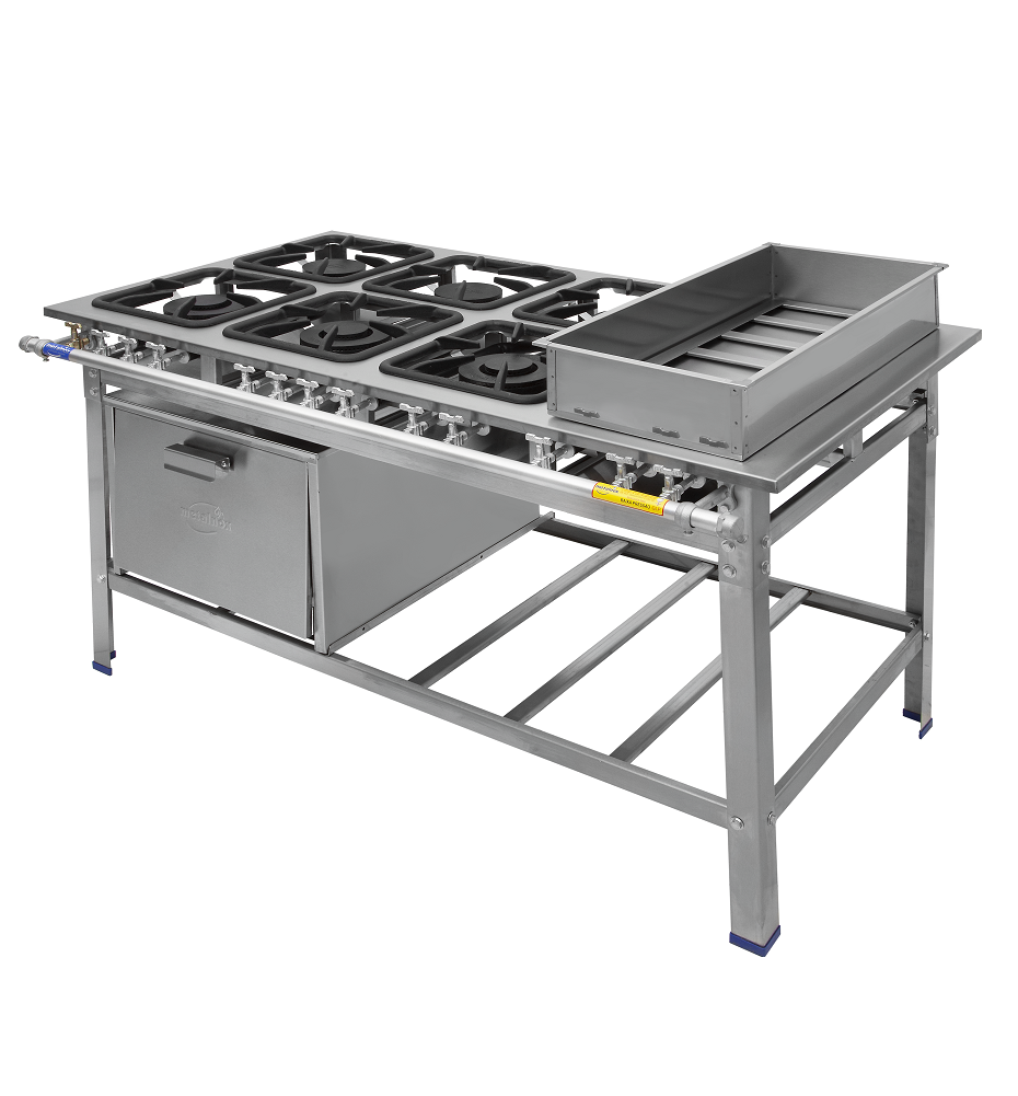 FOGÃO EM PARALELO COM 6 BOCAS, BANHO MARIA E FORNO